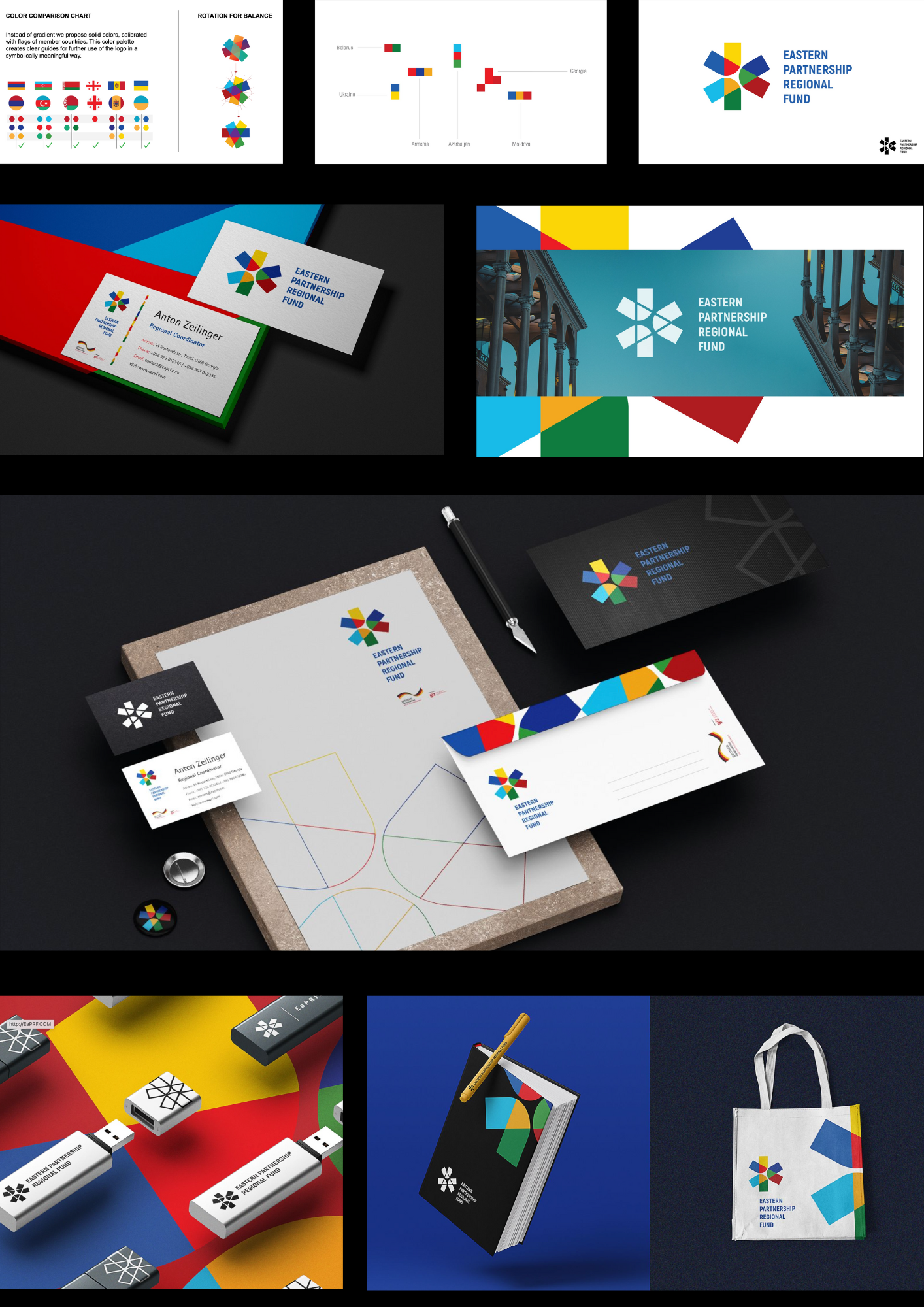 The redesign of the logo and visual identity for the Eastern Partnership Regional Fund is supported by GIZ Georgia. The symbol represents the six Eastern Partnership (EaP) member countries (Armenia, Azerbaijan, Belarus, Georgia, Moldova, and Ukraine) and the diverse directions the fund promotes in the region. It also illustrates a common ground where different elements converge and merge. The visual identity pattern draws inspiration from building blocks and pixels. Flags of the member countries were transformed into 8-bit art versions, which were then integrated into a pattern.